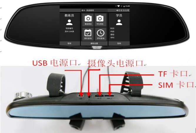 机动车驾驶培训车载计程计时终端—智能后视镜主机,简称智能后视镜主机, 在培训过程中进行身份验证、违规判断、学时记录及上报。其外观如下图所示。
